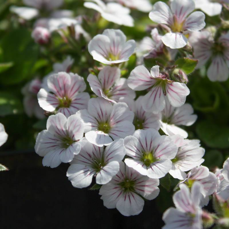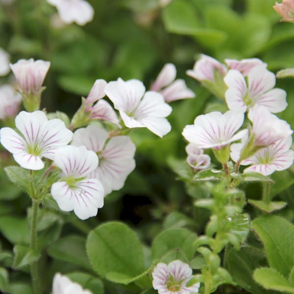 Kwiaty są drobne, bardzo dekoracyjne, o średnicy do 1 cm. Mają białą barwę z delikatnymi, różowymi prążkami, co nadaje im subtelnego uroku. Wyrastają pojedynczo lub zebrane są w luźne baldachogrona, unoszące się tuż nad liśćmi.