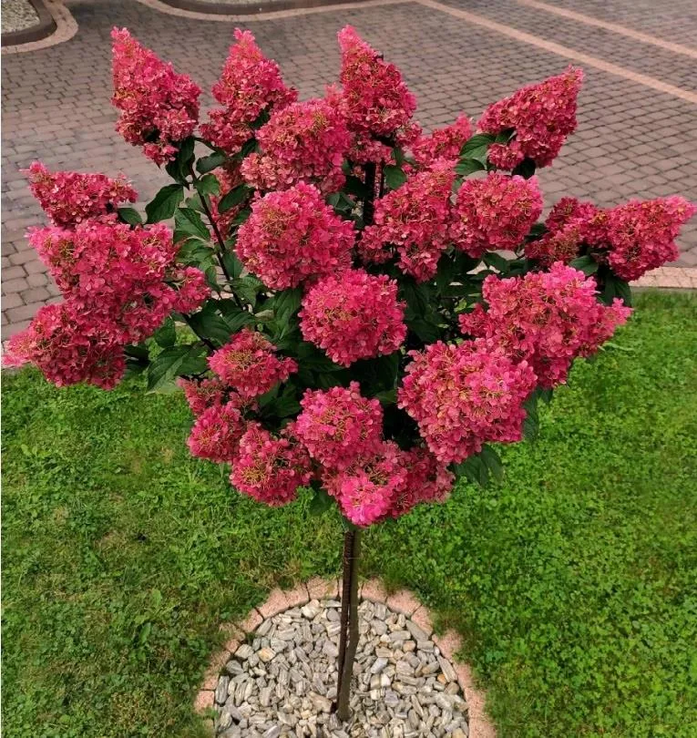 Zastosowanie hortensji bukietowej Fraise Melba na pniu w ogrodzie