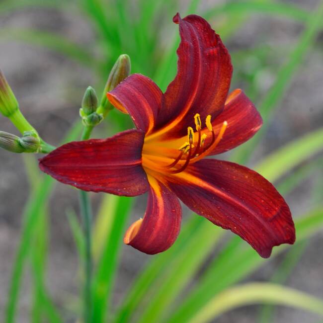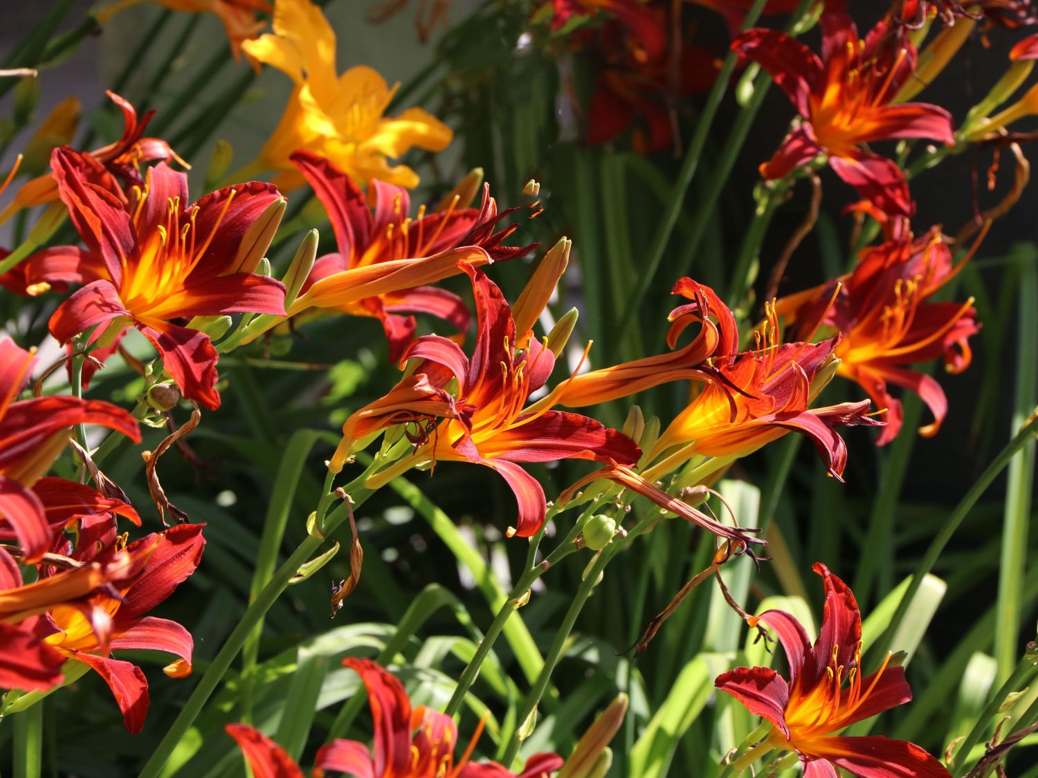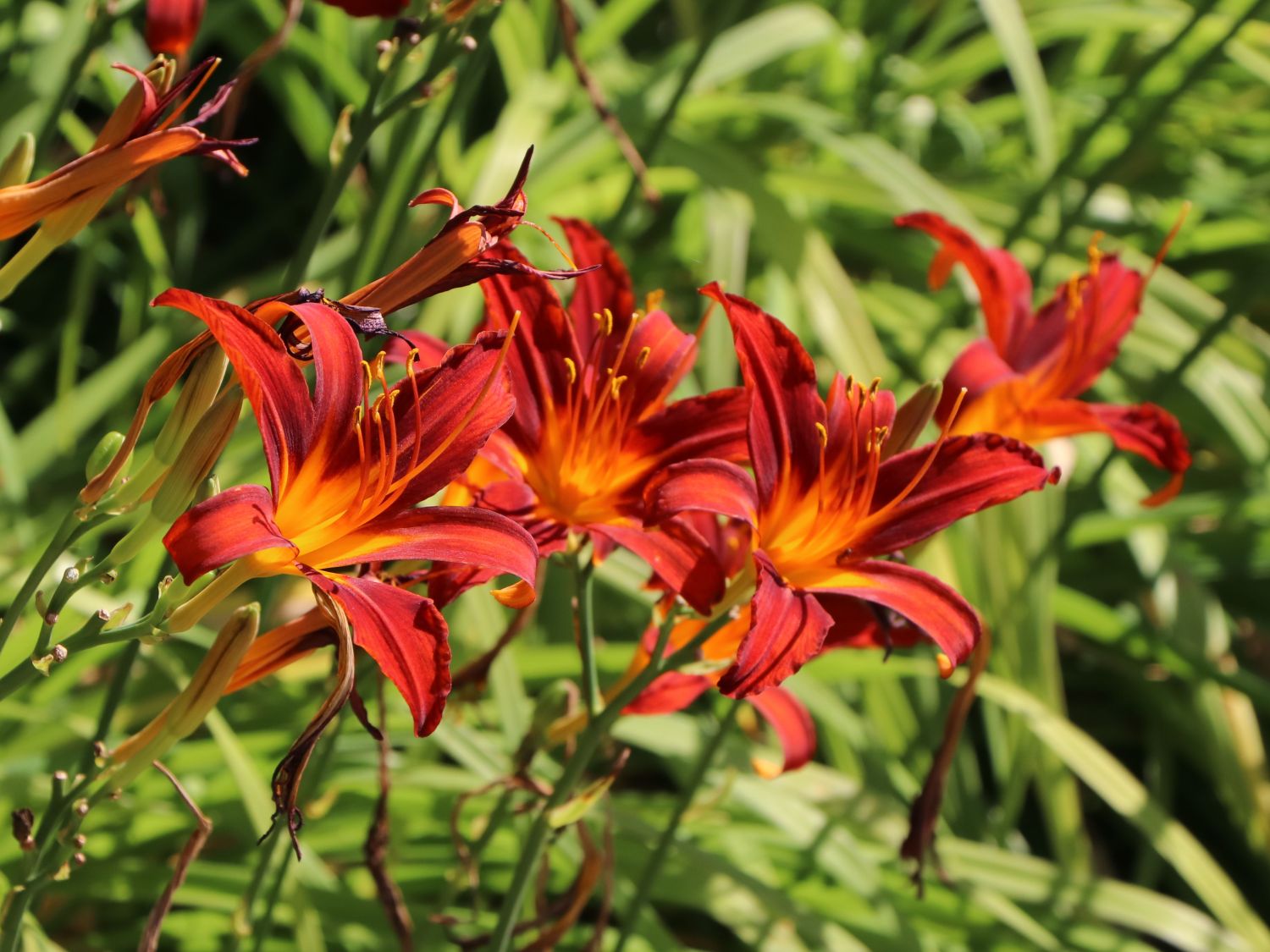 Od maja do lipca, a następnie od czerwca do sierpnia, ponad liśćmi wyrastają mocne, smukłe pędy kwiatostanowe. Liliowiec Sammy Russell tworzy duże, liliokształtne kwiaty o intensywnej ceglastoczerwonej barwie, która pięknie kontrastuje z żółtawym wnętrzem gardzieli. Kwiaty są bardzo charakterystyczne dla tej odmiany – proste, eleganckie i niezwykle efektowne. Każdy kwiat kwitnie tylko jeden dzień, lecz liczne pąki sprawiają, że roślina pozostaje w pełni ozdobna przez wiele tygodni.