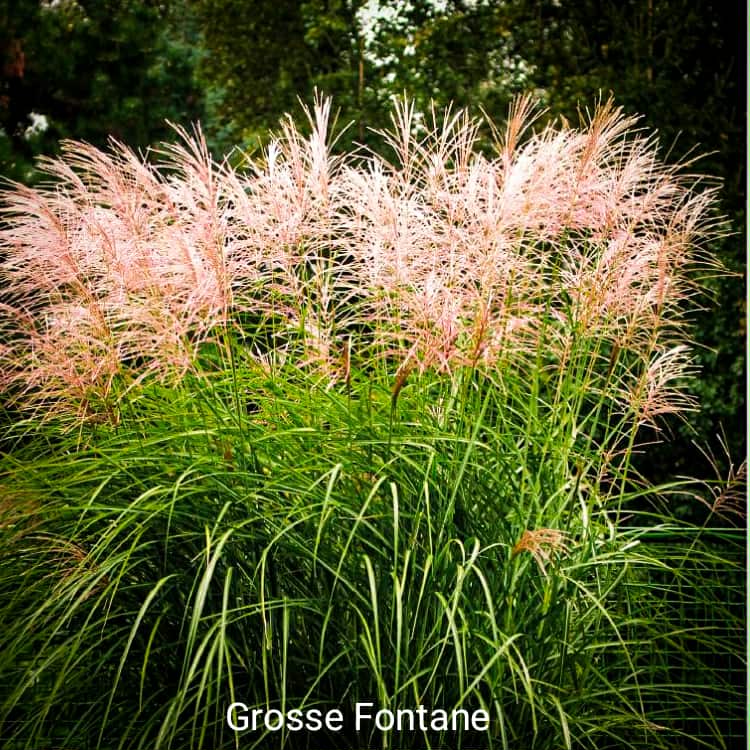 Miskant chiński ‘GROSSE FONTÄNE’ zakwita późnym latem, wytwarzając delikatne, jasne kwiatostany unoszące się ponad liśćmi. Po przekwitnięciu wiechy pozostają dekoracyjne również jesienią i zimą, nadając ogrodowi strukturę także poza sezonem wegetacyjnym.